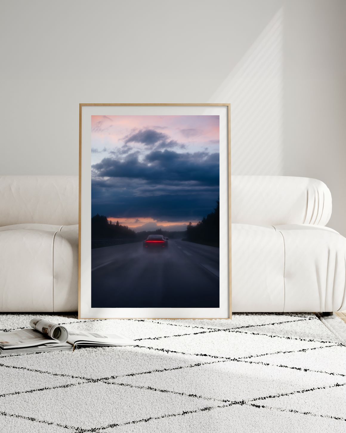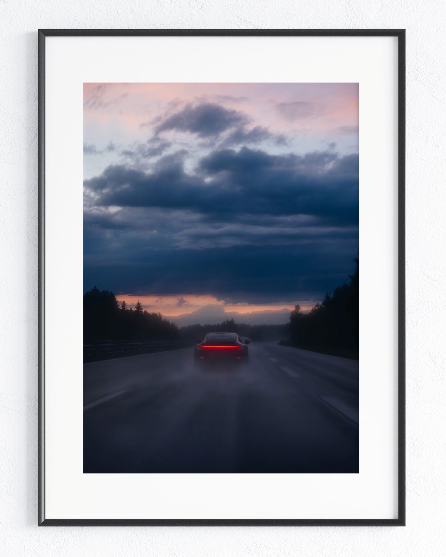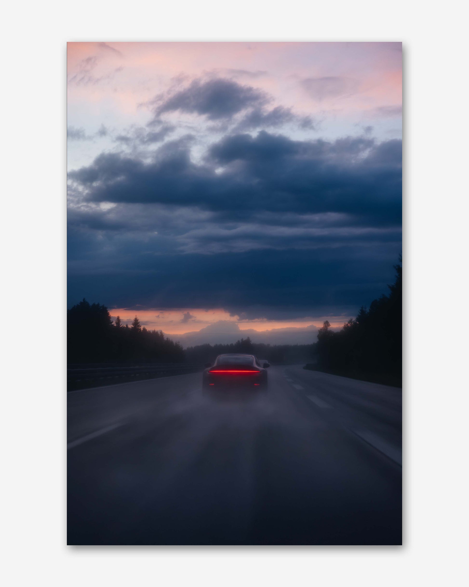 Allein auf weiter Strecke, umgeben von Wald, durchbricht ein Sportwagen die nasse Fahrbahn, als würde er dem Horizont entgegenfliegen. Hinter ihm verschwimmt die Welt zu einem fließenden Schleier, vor ihm öffnet sich der Himmel zwischen dunklen Wolken und warmem Glühen. Wann war dein letzter Moment völliger Freiheit?