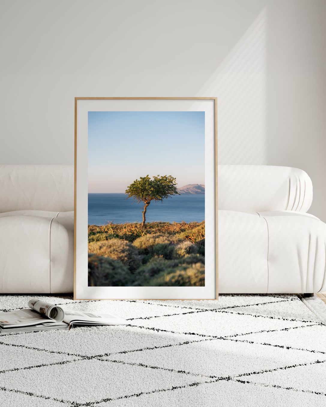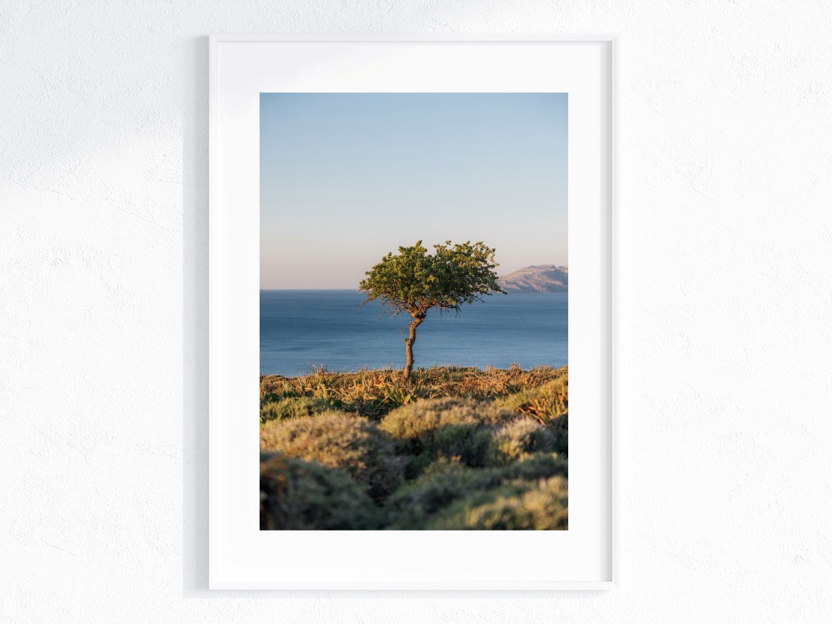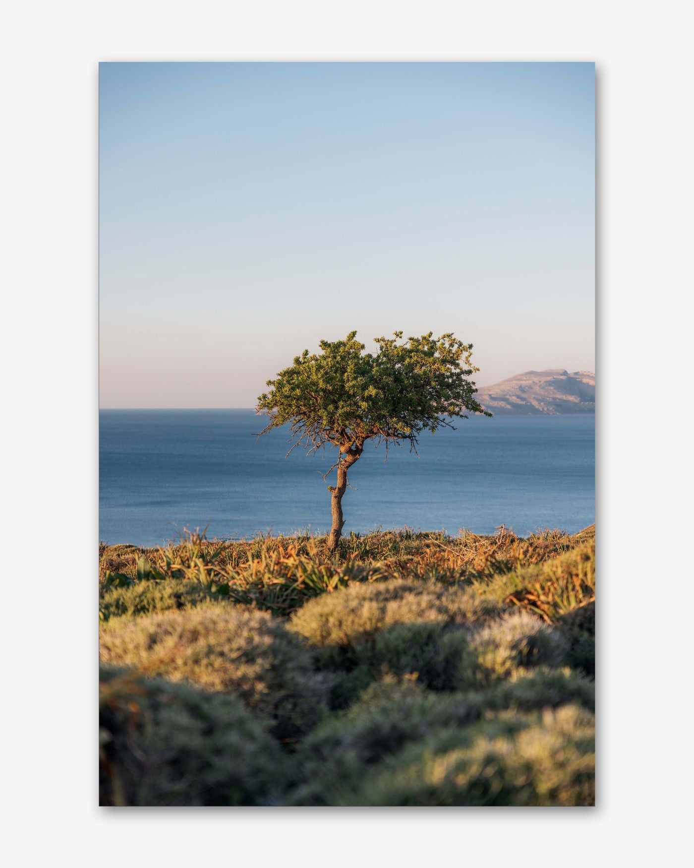 Ein Baum steht einsam auf einer windgepeitschten, griechischen Klippe und wacht über das weite, endlose Meer. Im Hintergrund zieht sich die sanfte Silhouette einer fernen Küstenlandschaft unter einem klaren Himmel entlang. Der Ort auf der Insel Rhodos lädt zur Ruhe, Einsamkeit und Gelassenheit ein. Spürst du die warme Meeresluft?