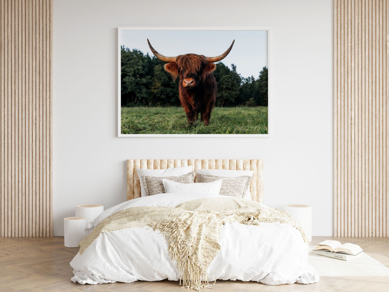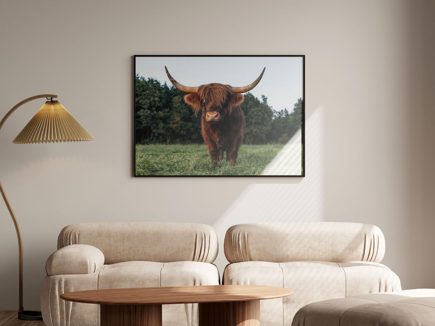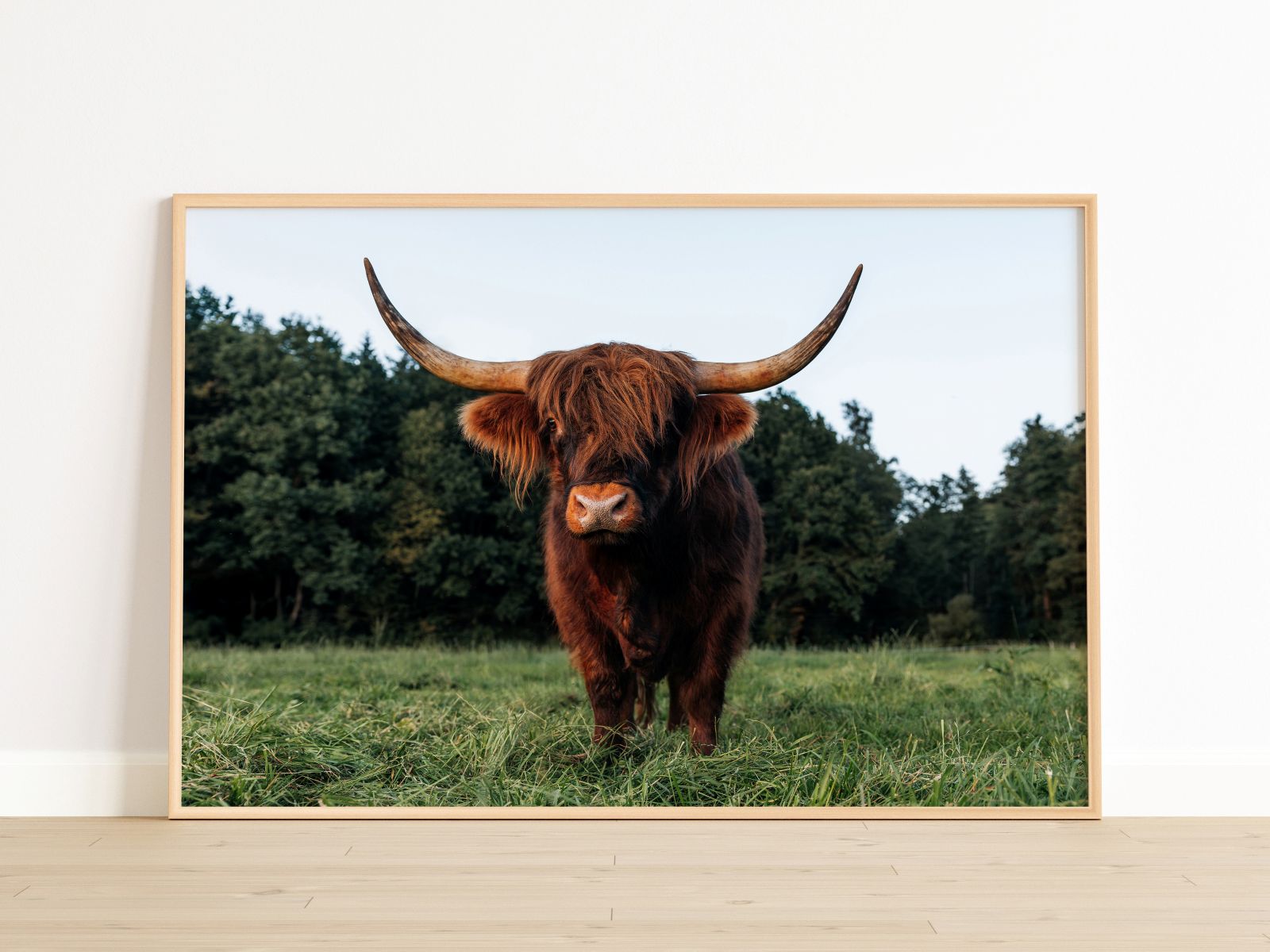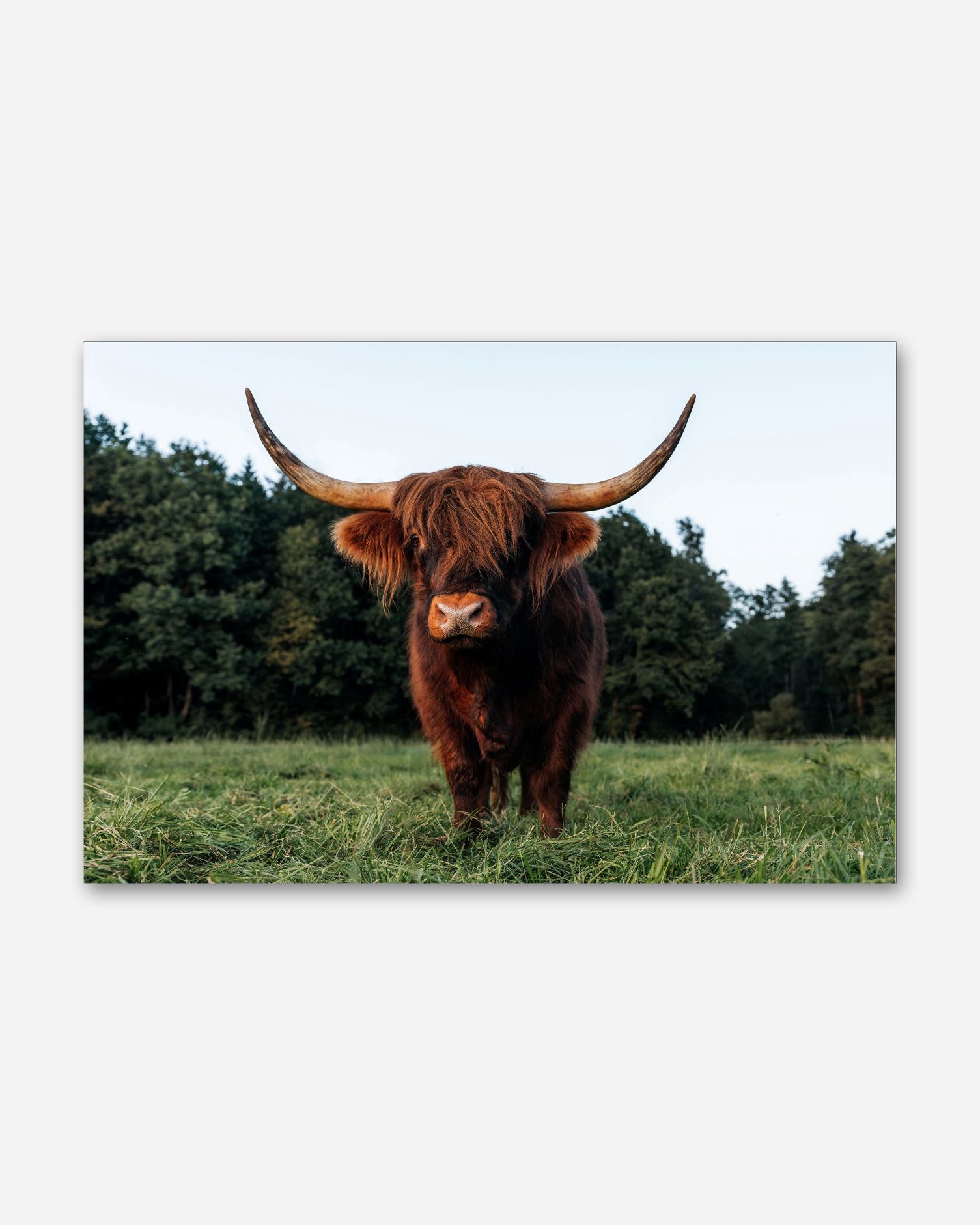 Ein schottisches Hochlandrind, eingefangen in der idyllischen Landschaft des Allgäus – kraftvoll, gelassen und voller Charakter. Dieses Bild verbindet wilde Ursprünglichkeit mit heimatlicher Ruhe und bringt natürliche Eleganz an jede Wand