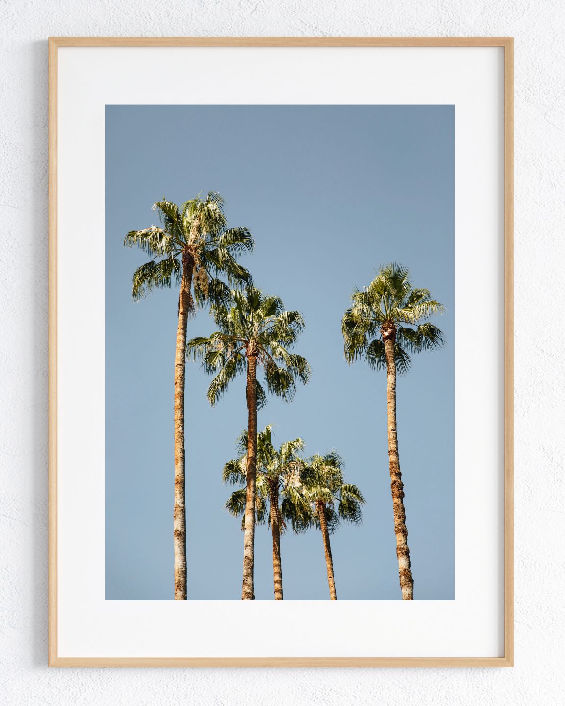 Hohe Palmen ragen elegant in den strahlend blauen Himmel und fangen das goldene Licht der Sonne ein. Ihre schlanken Stämme und das satte Grün der Palmblätter erzeugen ein harmonisches Zusammenspiel. Das Bild strahlt Urlaubsgefühl aus – fast so, als würde man selbst darunter stehen. Wünschst du dir auch ein Stück Sommer für dein Zuhause?