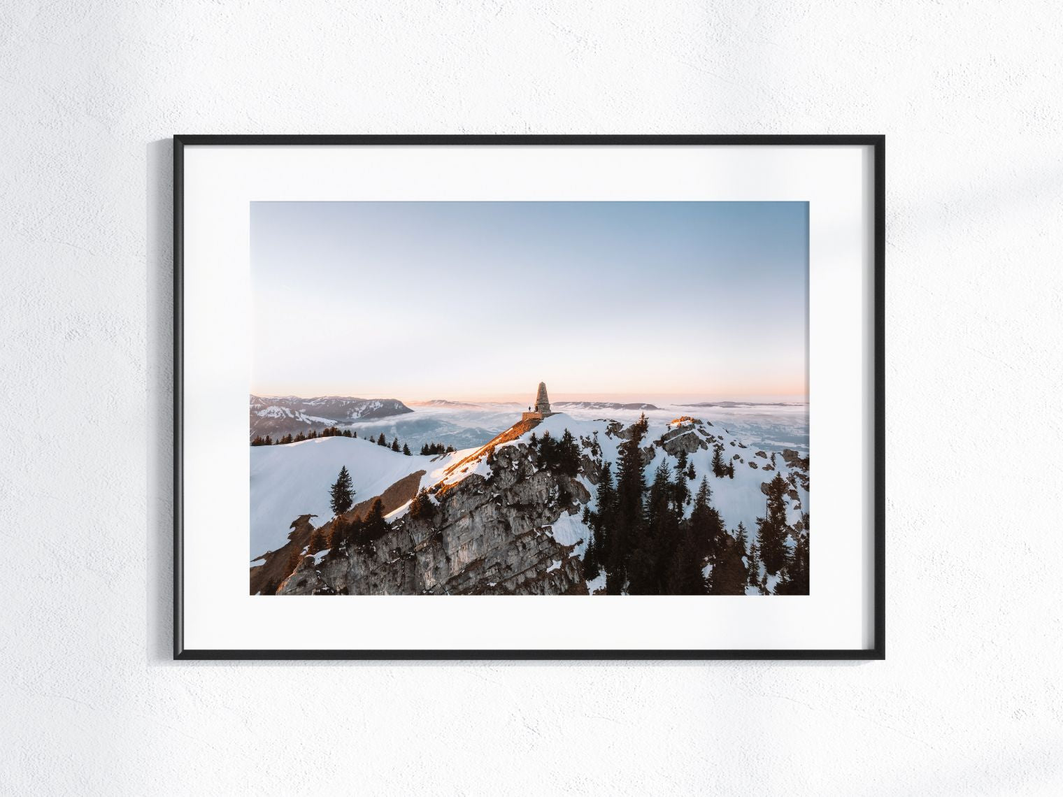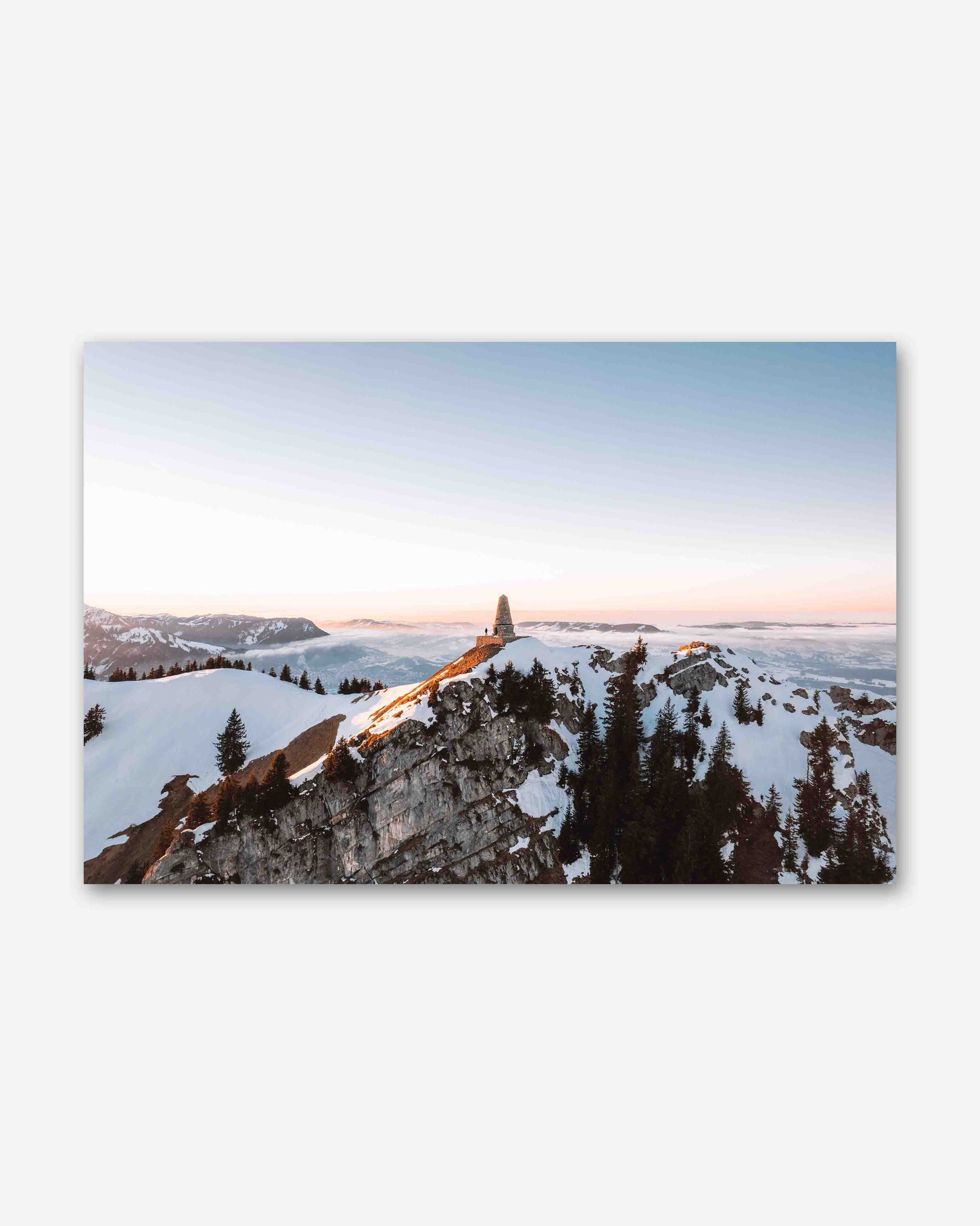 Der Grünten – als „Wächter des Allgäus“ überragt er stolz die verschneite Berglandschaft, getaucht in das goldene Licht des Sonnenuntergangs. Die letzten Strahlen streifen das Gipfeldenkmal, während die Schatten langsam ins Tal gleiten. Wer hier steht, spürt: Dies ist kein Berg wie jeder andere – dies ist ein Ruf. Wann folgst du ihm?